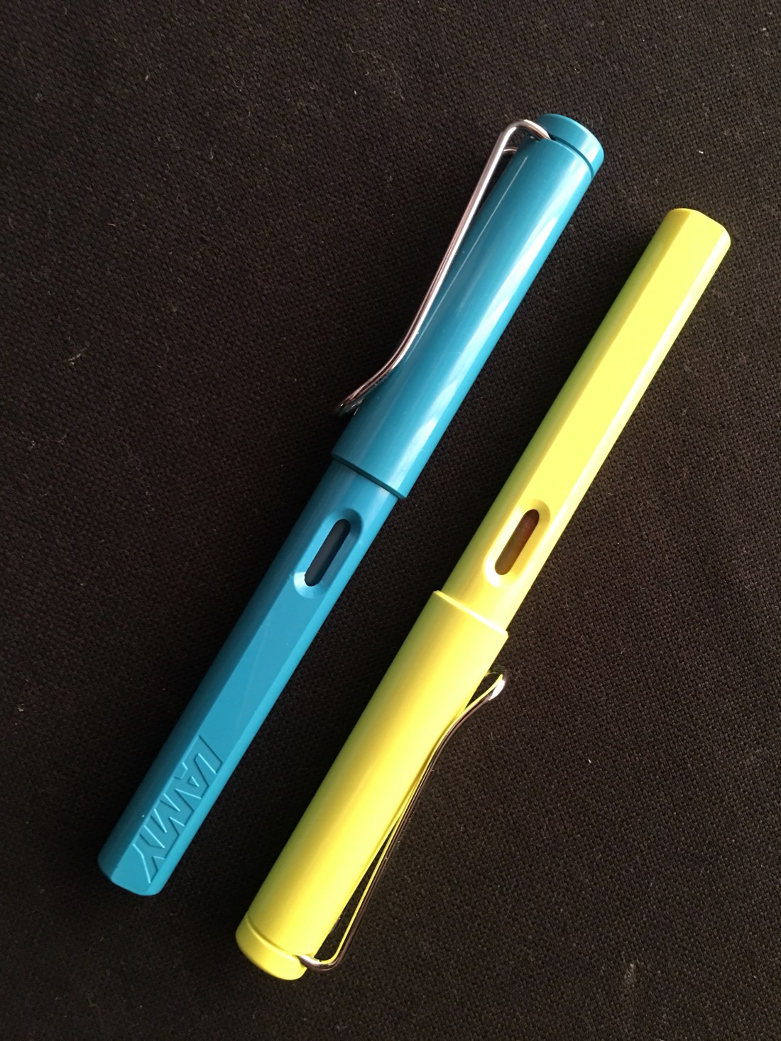Lamy makes a brightly colored plastic fountain pen called the Safari and I love mine. My favorite has an italic nib so I can imitate the sensuous sweeping strokes of Renaissance masters. I even have an optic yellow model I filled with (Japanese) fluorescent ink to use as a highlighter.